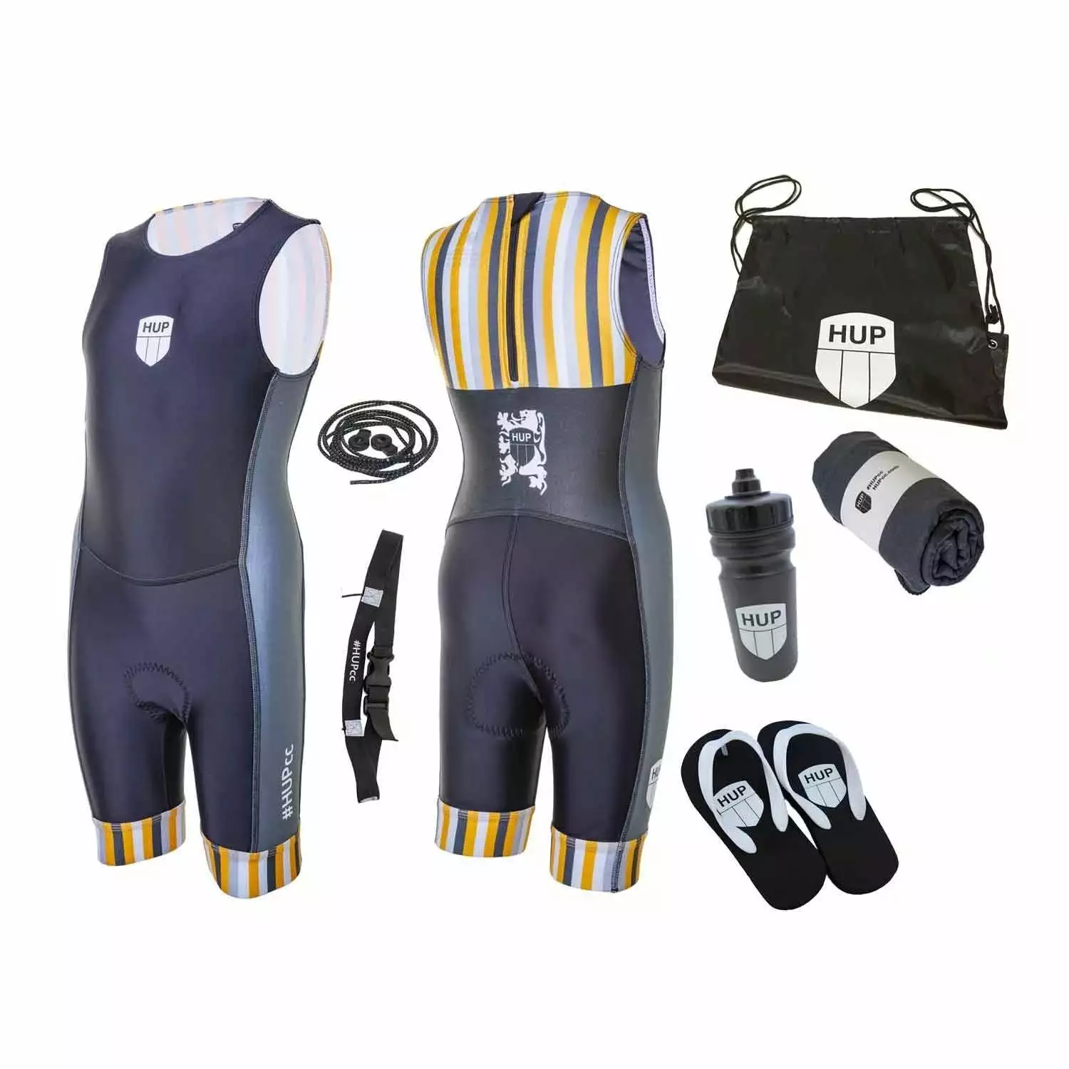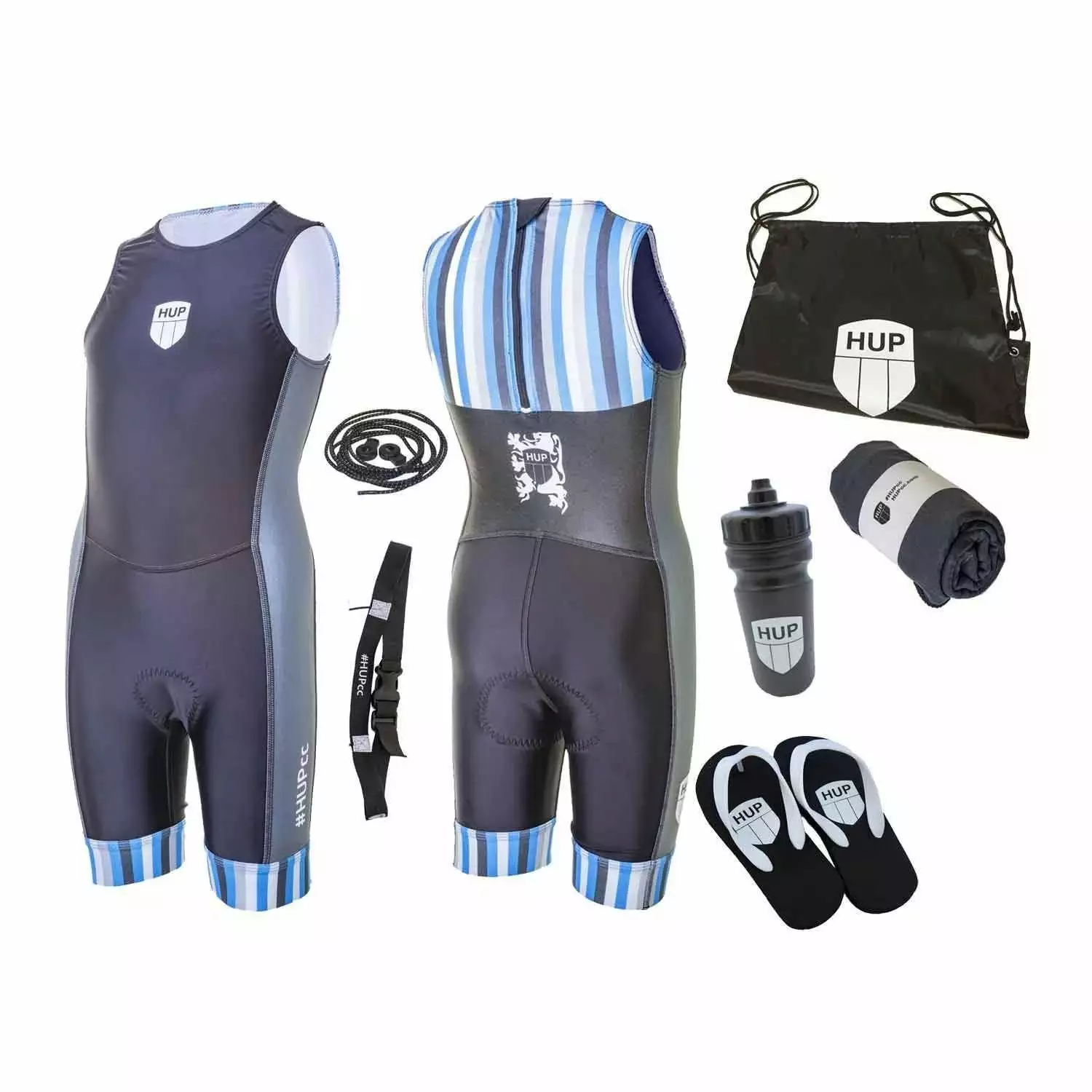 - 1x HUP trisuit (choice of 6 sizes, 3 colours)