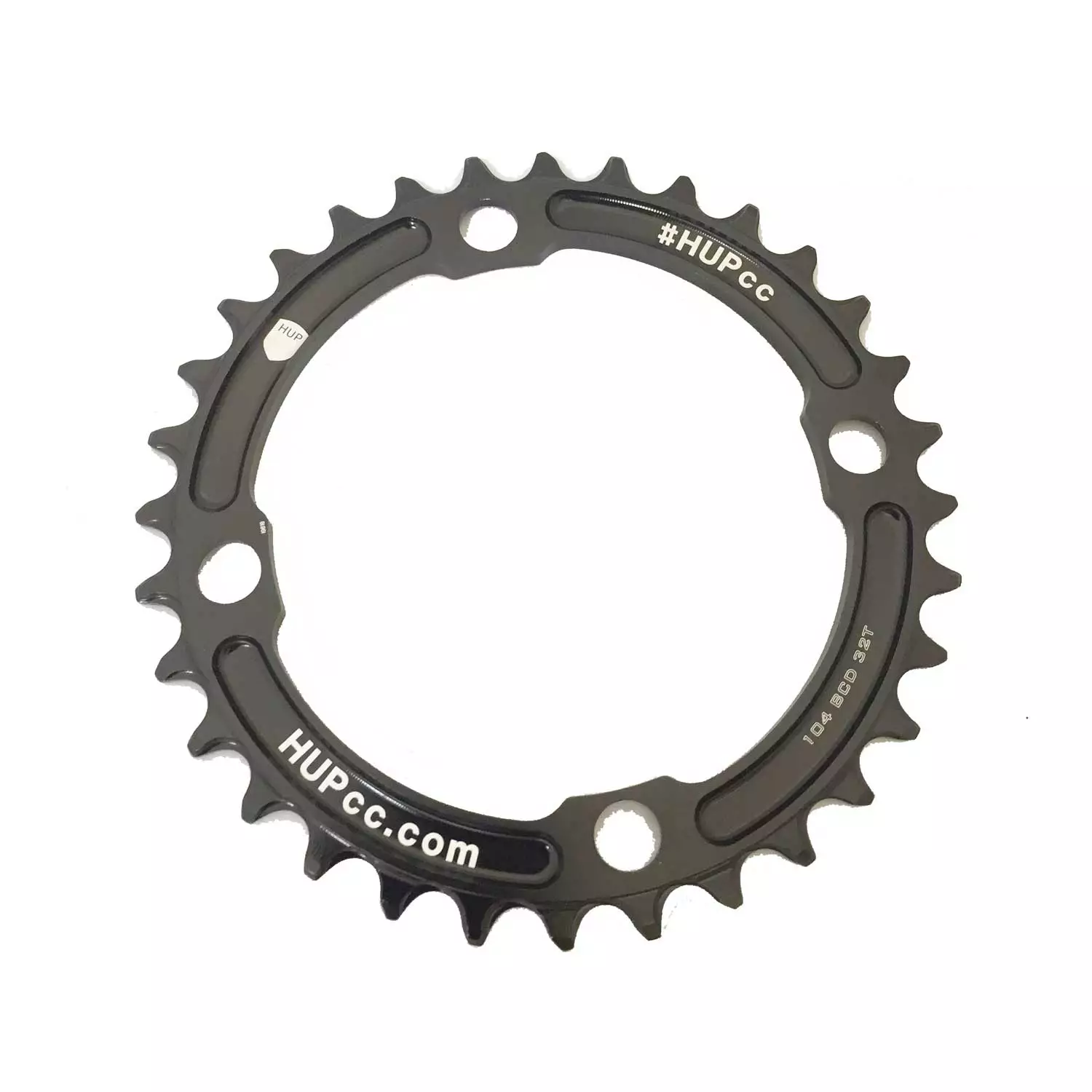 These HUPcc chainrings are CNC machined from 7075 T6 aluminium in the UK. Alternating narrow-wide profile teeth help reduce sideways movement in rough terrain which normally derails chains. Complex precision machined debris gullies help evacuate mud for all weather performance.