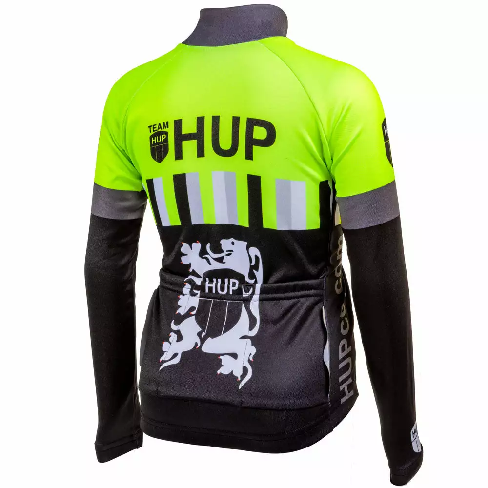 Stylish and 100% Italian made TEAM HUP Kids Winter Long Sleeved Cycling Jersey with high-visibility Fluro details, reflective stripes and Flanders Lions. Highly effective at keeping their core temperature up during Winter Cyclocross or Road rides.